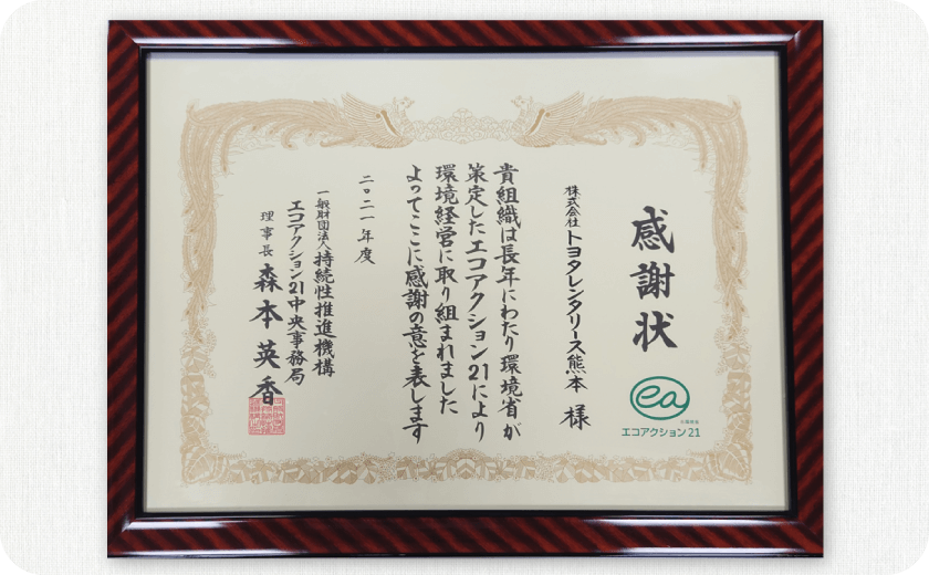 2013年にエコアクション21の認証を取得し継続して取り組んでいます。HEV車の積極導入や節電節水、廃棄物の削減によりCO2排出量の削減に努め、また、ゴミの分別徹底やリサイクルを推進するなど、地球環境に配慮した行動を心がけています。